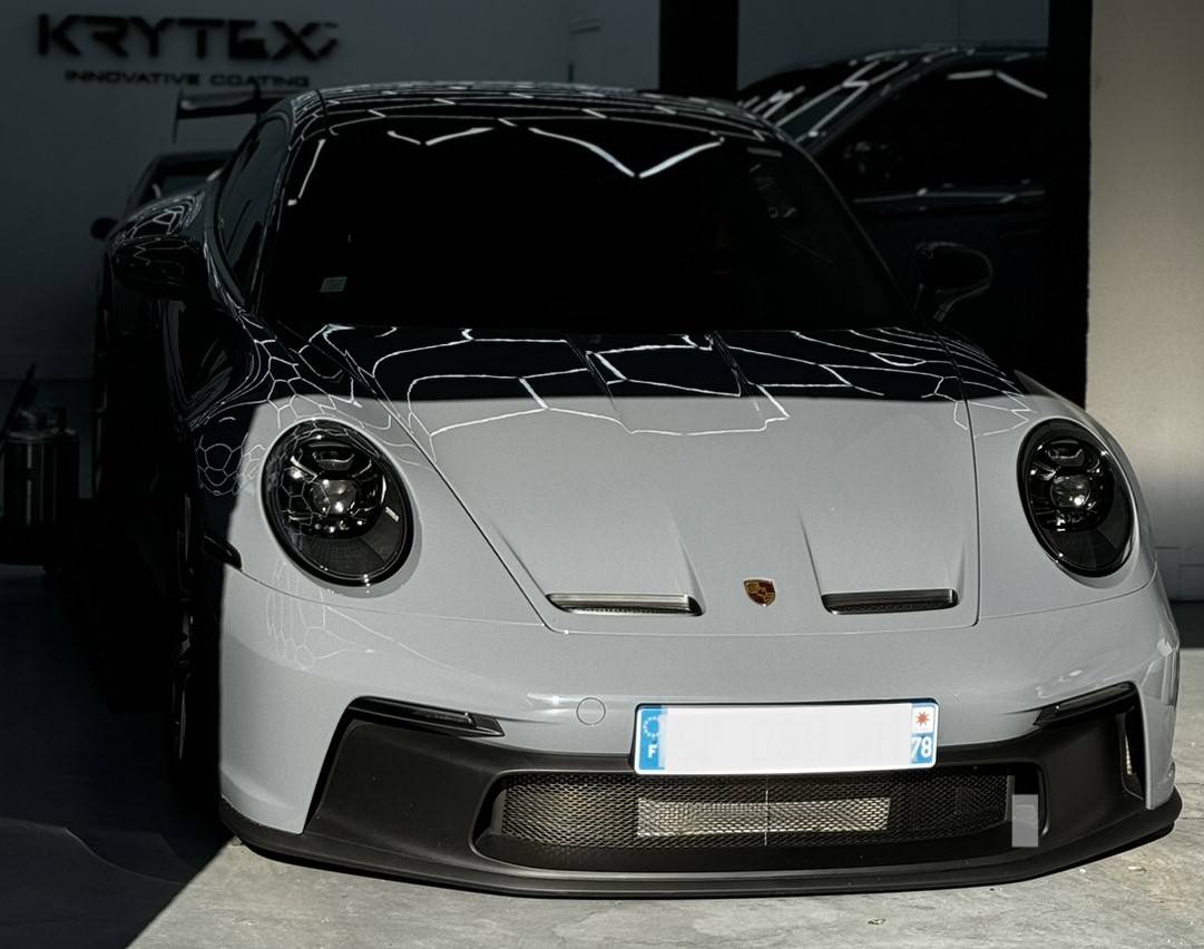 La pose d'un PPF Xpel Ultimate sur le pare-choc arrière de cette Porsche GT3 992 du client, près de Versailles dans les Yvelines, a été réalisée après que ce dernier ait fait repeindre son pare-chocs.